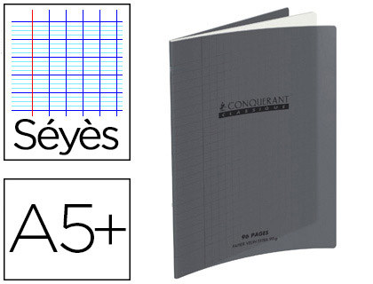 Cahier piqué conquérant classique couverture polypropylène rigide transparente a4 21x29,7cm 96 pages 90g séyès gris
