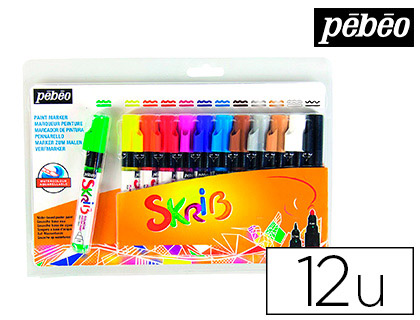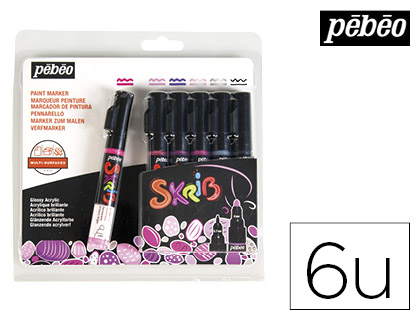 Marqueur peinture pébéo skrib gouache poésie mèche 4mm coloris violet rose bleu primaire argent blanc et or 6 unités